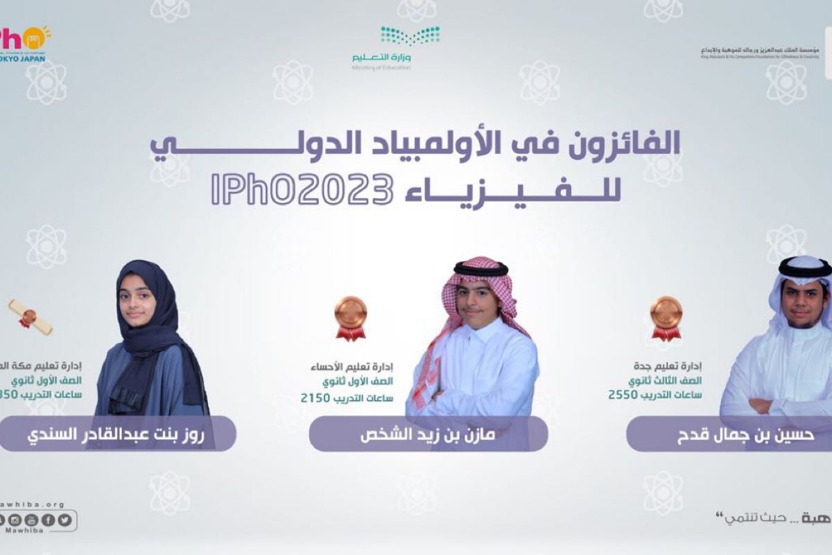 فاز طلاب مؤسسة الملك عبدالعزيز للموهبة والإبداع «موهبة»، ب 3 جوائز عالمية في منافسات ”أولمبياد الفيزياء الدولي“ 2023 باليابان، من بينهم الطالب مازن الشخص بالصف الأول الثانوي، من إدارة تعليم الأحساء والذي ظفر بميدالية برونزية.