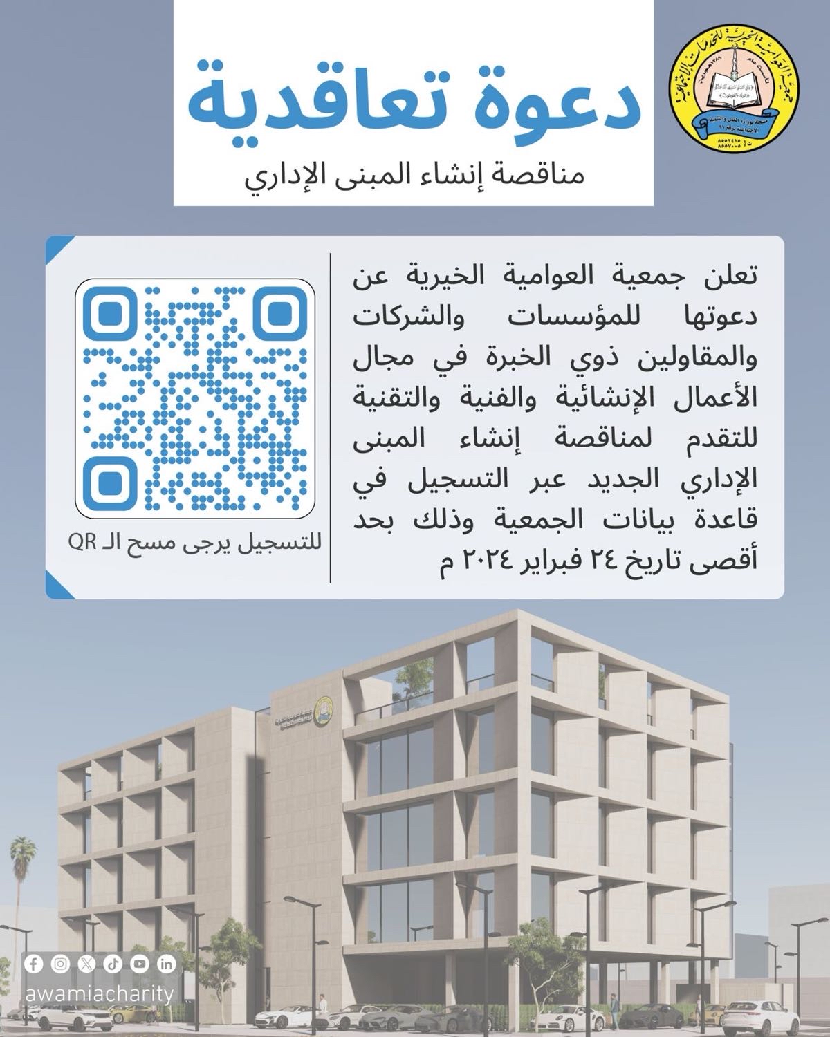 دعت جمعية العوامية الخيرية، المؤسسات والشركات والمقاولين ذوي الخبرة في مجال الأعمال الإنشائية والفنية والتقنية، إلى التقدم لمناقصة إنشاء المبنى الإداري الجديد، عبر التسجيل في قاعدة بيانات الجمعية، وذلك بحد أقصى تاريخ 24 فبراير 2024 م.