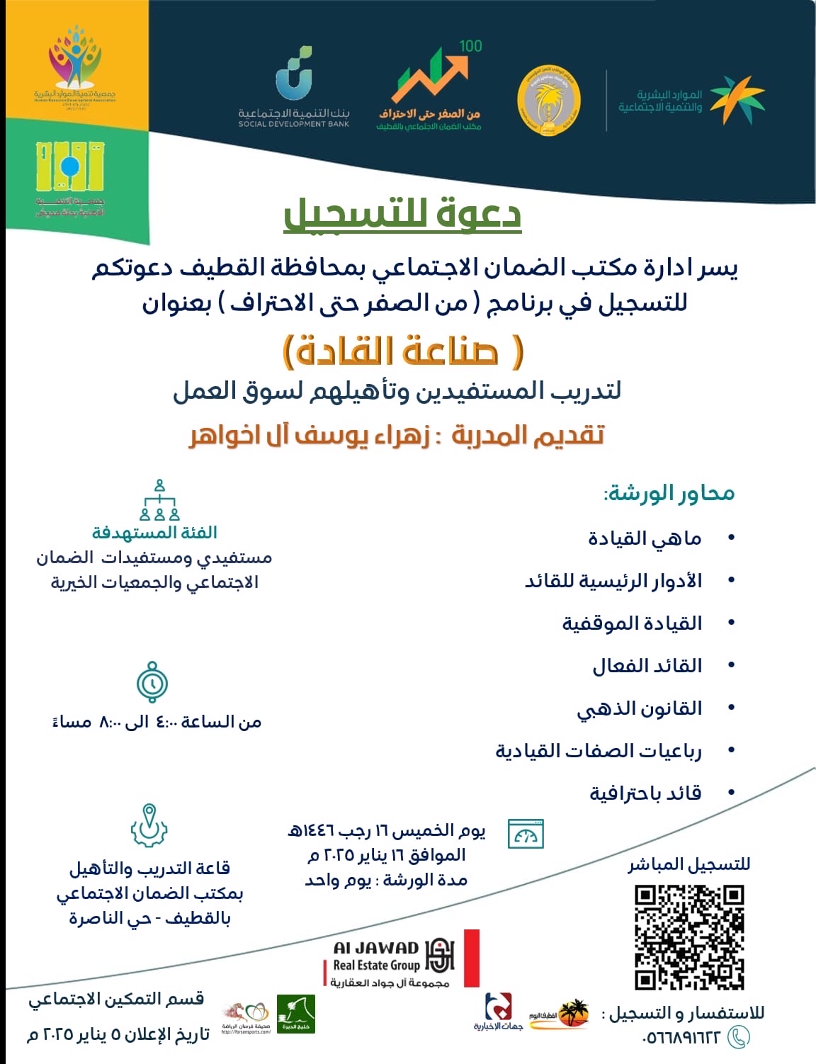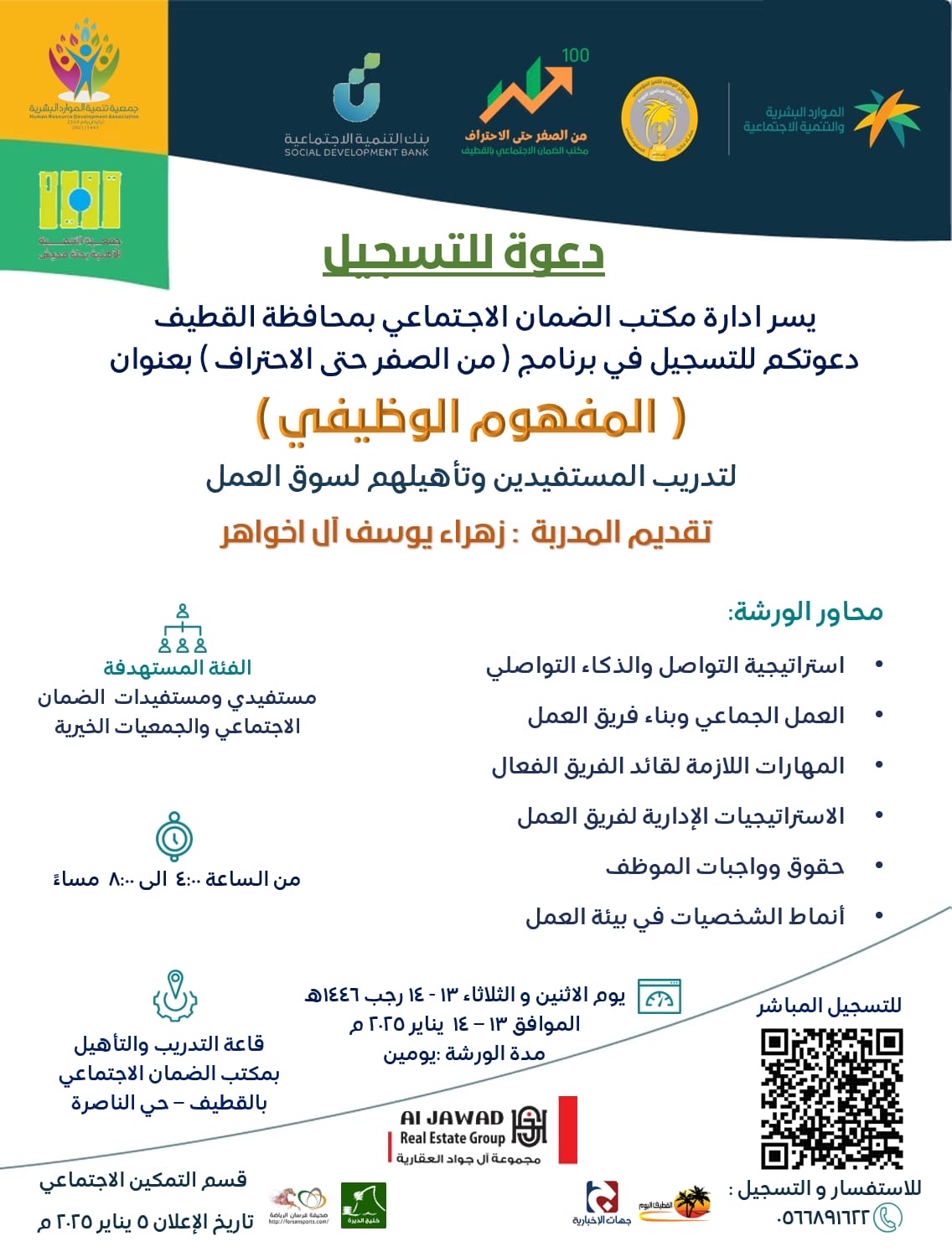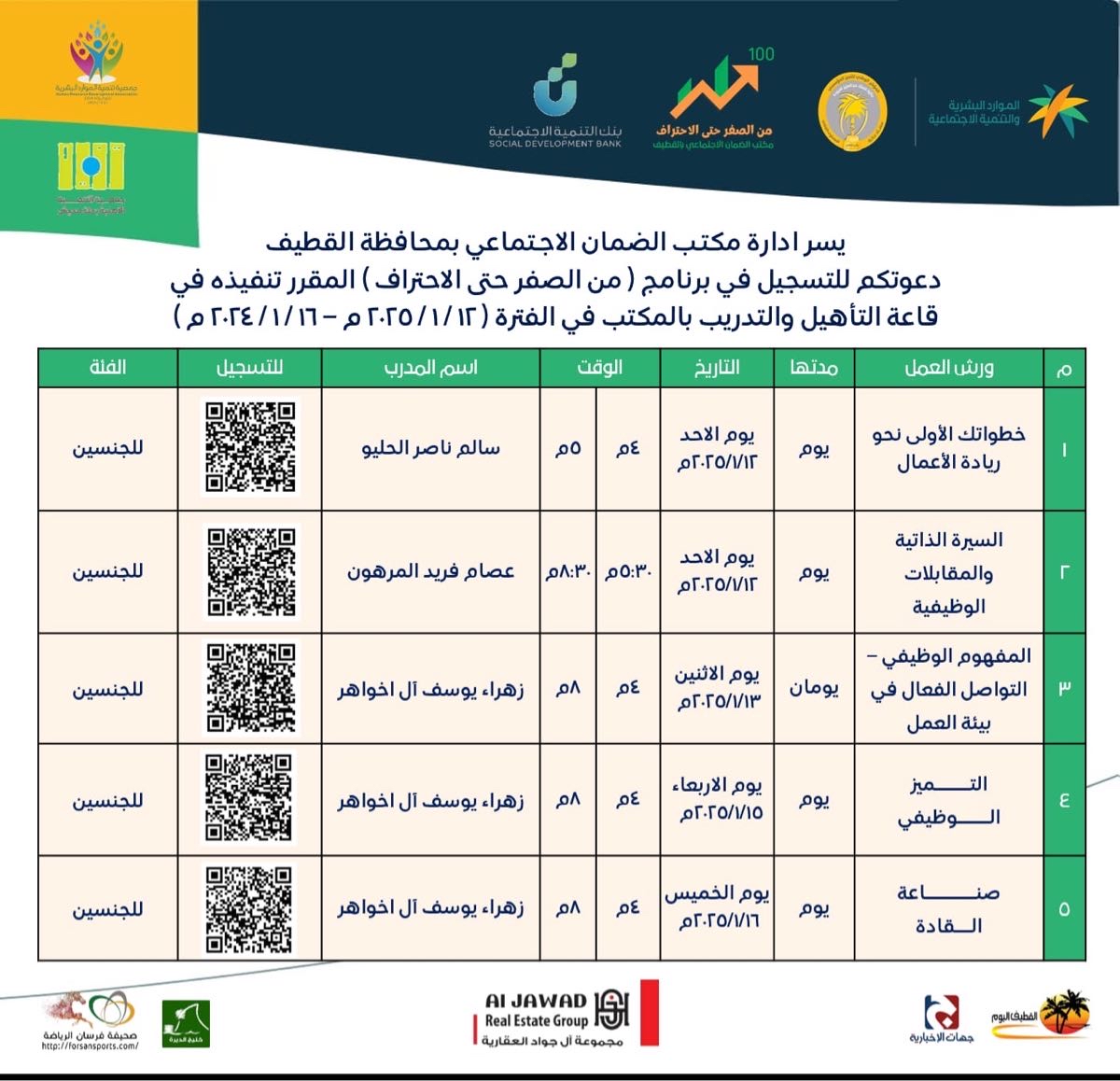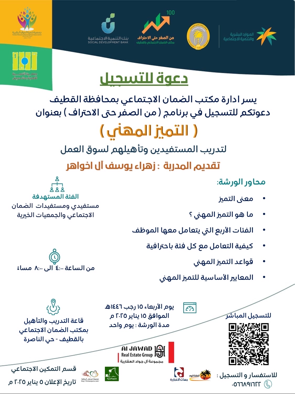 تحت عنوان ”السيرة الذاتية والمقابلات الوظيفية“، ينظم مكتب الضمان الاجتماعي بمحافظة القطيف، ورشة عمل بالتعاون مع جمعية تنمية الموارد البشرية بسيهات، وجمعية التنمية الأهلية بحلة محيش، وذلك ضمن برنامج ”من الصفر إلى الاحتراف“.