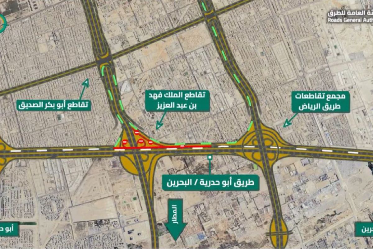 وأشارت إلى إغلاق المخرج القادم من طريق الملك فهد شرقًا باتجاه طريق أبو حدرية شمالًا، وإغلاق المخرج من طريق أبو حدرية شمالًا والمؤدي إلى طريق الملك فهد غربًا باتجاه المطار.