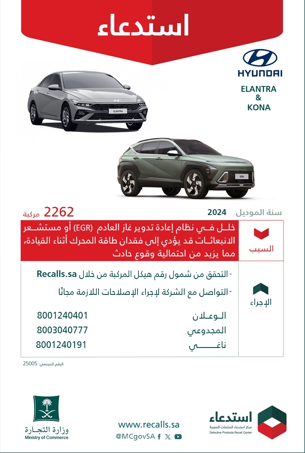 أعلنت وزارة التجارة عن استدعاء شامل لـ 2262 مركبة من طرازي هيونداي إلنترا وكونا موديل 2024، وذلك بعد اكتشاف خلل فني في نظام إعادة تدوير غاز العادم EGR أو مستشعر الانبعاثات.