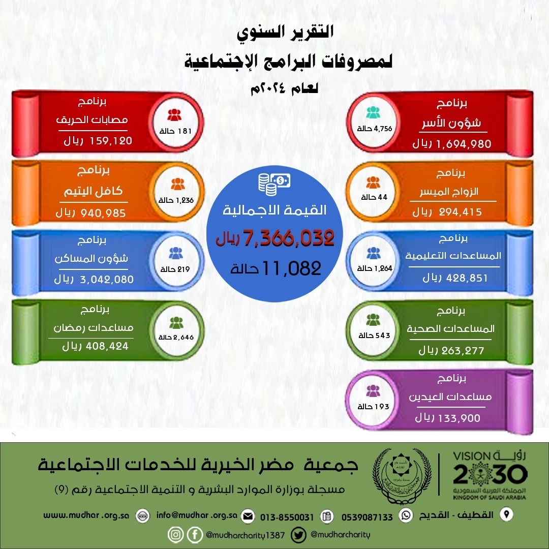 أنفقت جمعية مضر الخيرية مبلغًا وقدره 7,366,032 ريالًا خلال العام المالي 2024 على 11,082 حالة من الأسر المتعففة، وذلك من خلال برامجها التنموية والرعوية المتنوعة، وفقًا للتقرير المالي الصادر عن الإدارة المالية بالجمعية.