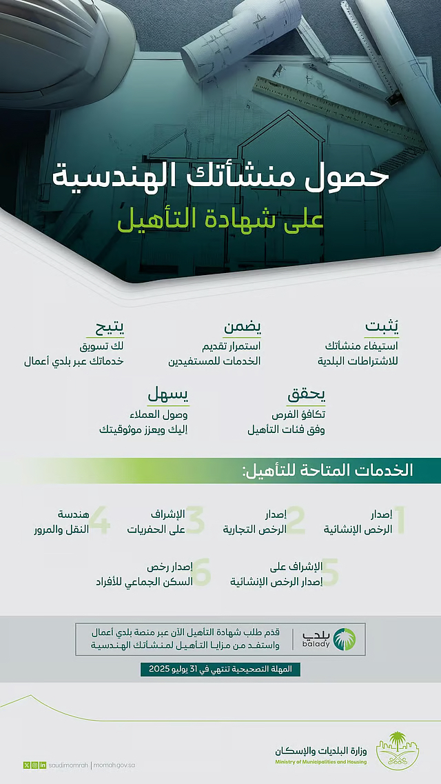 وأوضحت ”البلديات والإسكان“ أن الخدمات المشمولة في المرحلة الأولى من عملية التأهيل خدمات المكاتب الهندسية تتمثل في المجلات التالية، إصدار الرخص الإنشائية والتجارية والإشراف عليها، والإشراف على الحفريات، وإصدار رخص السكن الجماعي للأفراد، وهندسة المرور والنقل.