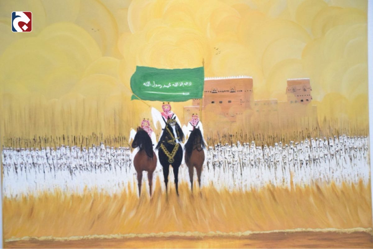 وأوضح أن لوحته بهذه المناسبة تتضمن عنصرًا أساسيًا هو قصر الدرعية، منبت الدولة السعودية، وكأنه يشرف على انطلاق الراية التي خرجت من هناك وستظل مرفوعة بأيدي أبنائها.