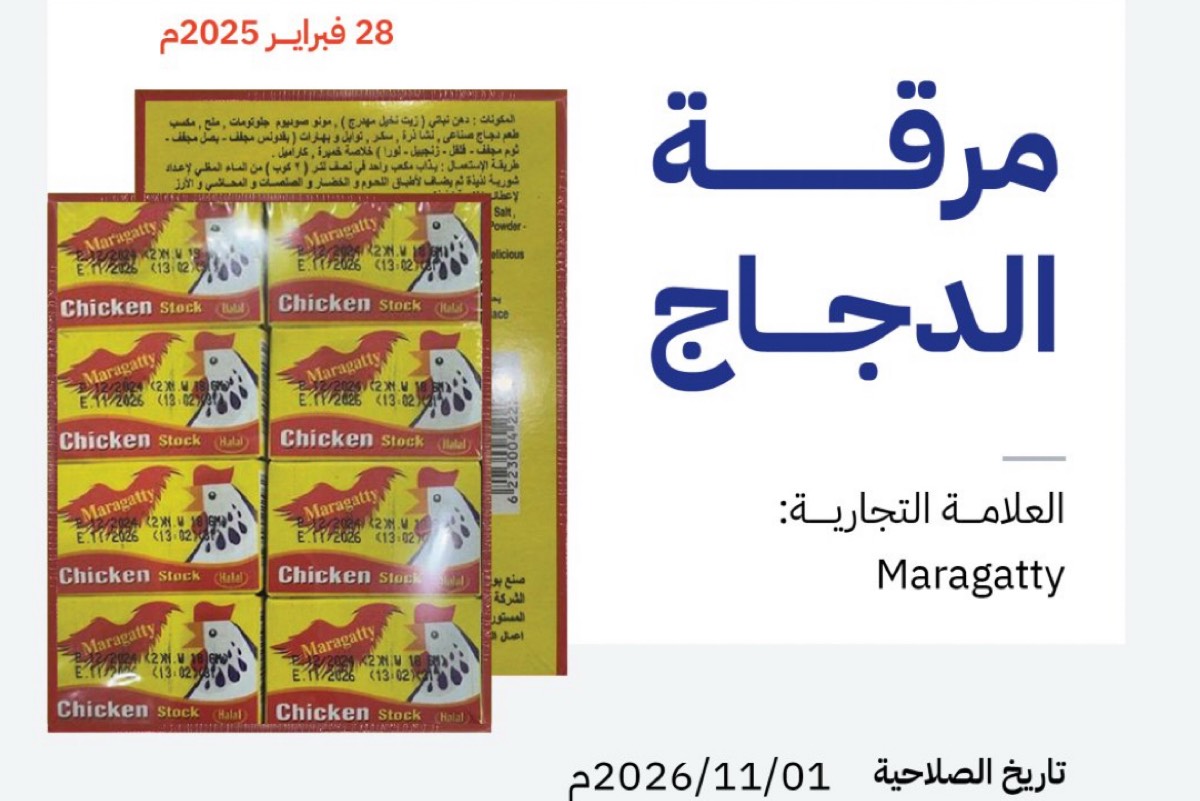 حذرت الهيئة العامة للغذاء والدواء المستهلكين من منتج مرقة الدجاج الذي يحمل العلامة التجارية ”Maragatty“، وطالبتهم بالتخلص الفوري مما لديهم من هذا المنتج، حفاظًا على صحتهم. وأكدت الهيئة أنها بادرت بسحب المنتج من الأسواق، كإجراء احترازي، نظرًا لمخالفته للوائح.