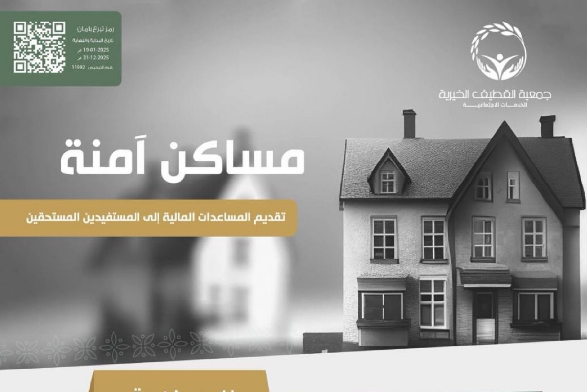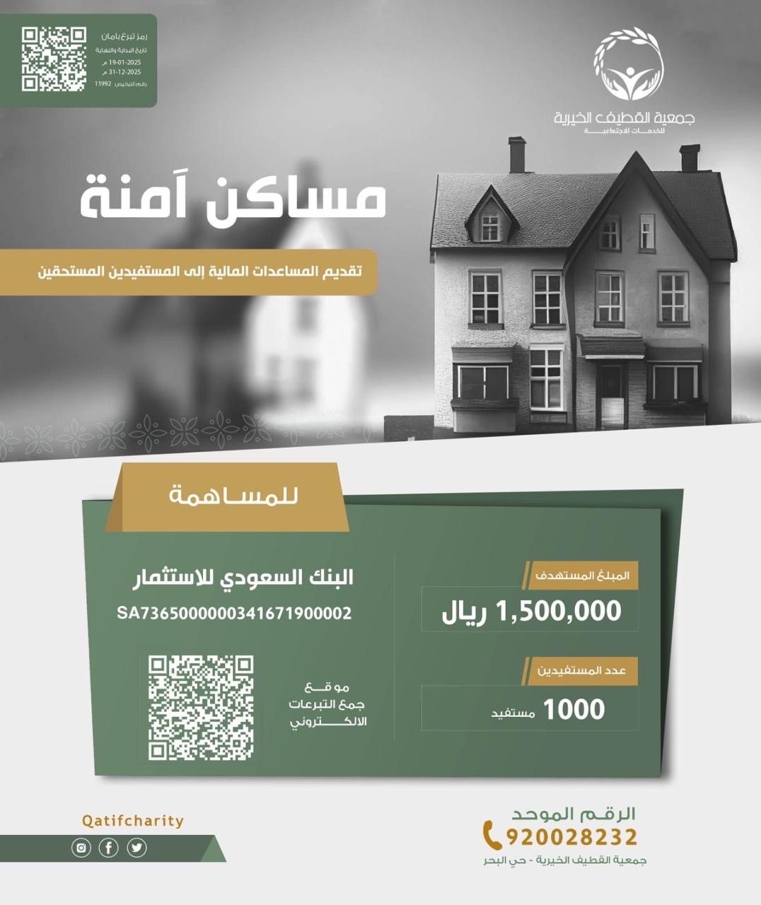أطلقت جمعية القطيف الخيرية مبادرة إنسانية تحت عنوان ”مساكن آمنة“، تسعى من خلالها إلى جمع تبرعات بقيمة 1,5 مليون ريال.