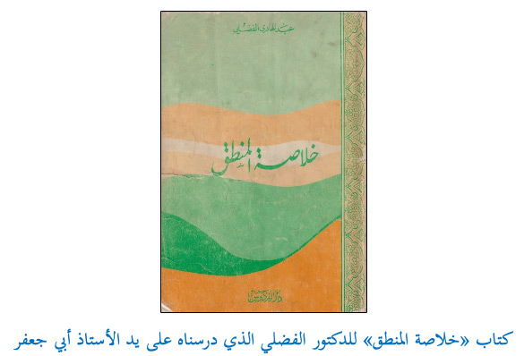 إلى أن وصلنا إلى شهر رمضان من ذلك العام 1411ﻫ، فبدأنا معه درسًا جديدًا، وهو: خلاصة المنطق للدكتور عبد الهادي الفضلي «ره» «ت 1434ﻫ»، وما انتهى الشهر الفضيل، حتّى انتهينا من دراسته بالكامل. ولم يكن أيٌّ منّا يعرف الدكتور الفضلي، ولأنه كان من أهم الشخصيات العلمائية الفاعلة في المنطقة حينها، وبالخصوص في شهر رمضان المبارك، أحبّ الأستاذ أبو جعفر أن يربطنا بهذه الشخصية انطلاقًا من كتابه الذي شرعنا في دراسته للتوّ، إذ شوّقنا في إحدى ليالي الشهر الفضيل، بأن سألنا: «ما رأيكم أن تتعرّفوا إلى شخصية المؤلّف لكتاب الخلاصة؟»، فأجبناه برغبتنا في ذلك، فأبلغنا بأن الشيخ الفضلي لديه محاضرة مهمّة في تلك الليلة، وأخذ يحدّثنا عن برامج المحاضرات الدينية التي تقام في أكثر من بلدة في المنطقة، وأنّ من أبرز المحاضرين فيها الدكتور الفضلي، واقترح علينا أن ننتهي من الدرس ونتوجه لحضورها. وهذا ما حدث فعلًا، إذ توجّهنا متشوقين للقاء مؤلّف الكتاب عيانًا، وحضرنا محاضرته في بلدة الجارودية على ما أظن، وكانت حول الإعلام، وربما كانت محاضرته التي بعنوان: «الإعلام وأثره السلبي في المجتمع».