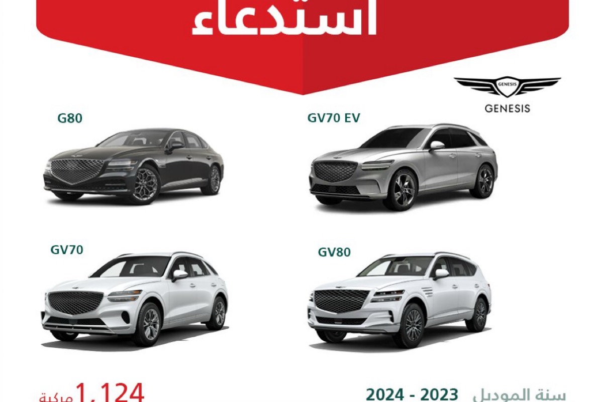 أعلنت وزارة التجارة، اليوم، عن استدعاء 1,124 مركبة من طراز ”هيونداي GENESIS“ موديلات 2023 و 2024، وذلك لوجود خلل في نظام لوحة العدادات.