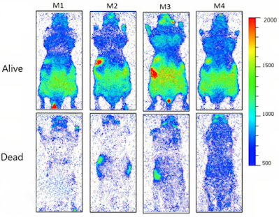 لمعرفة ما إذا كان من الممكن توسيع العملية من أنسجة معزولة وتطبيقها على كائنات حية بأكملها، استخدم الباحثون جهاز مضاعفة الشحنة المقترنة وكاميرات ال EMCCC, لمقارنة أضعف الانبعاثات الضوئية من كامل الفأر [11] - أولاً من الفئران الحية منها، ومن ثم من الميتة مها.