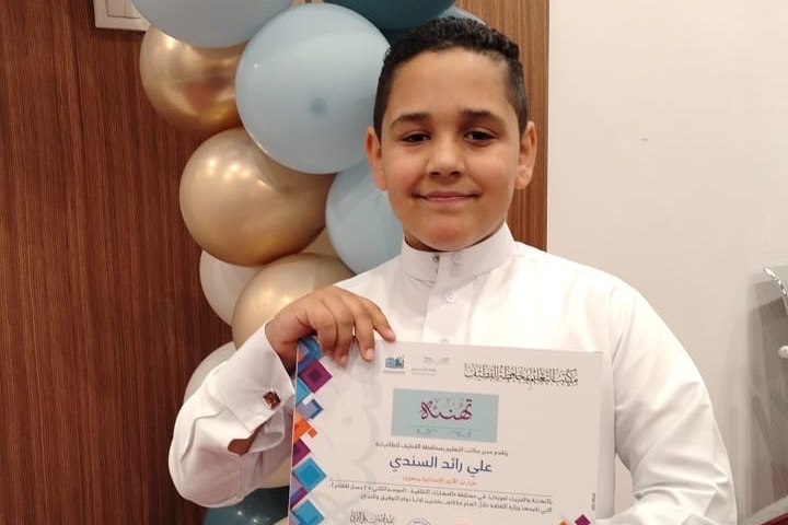 سجّل الطالب علي رائد السندي، البالغ من العمر 9 سنوات، ويدرس بالصف الرابع الابتدائي في مدرسة ضرار بن الأزور بمدينة صفوى، إنجازًا نوعيًا بحصوله على المركز الأول في مسار ”المانجا“ ضمن المسابقة الثقافية على مستوى المنطقة الشرقية، ليتأهل بذلك لتمثيل المنطقة في المعسكر الوطني للفائزين على مستوى المملكة بالرياض.