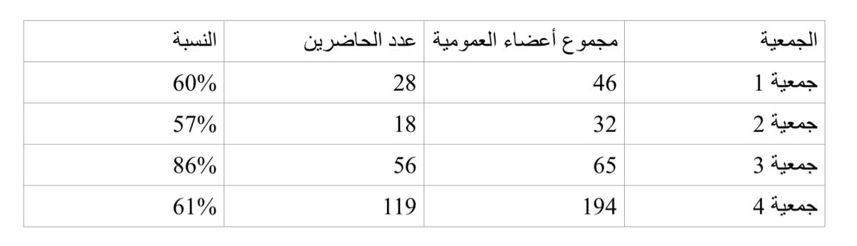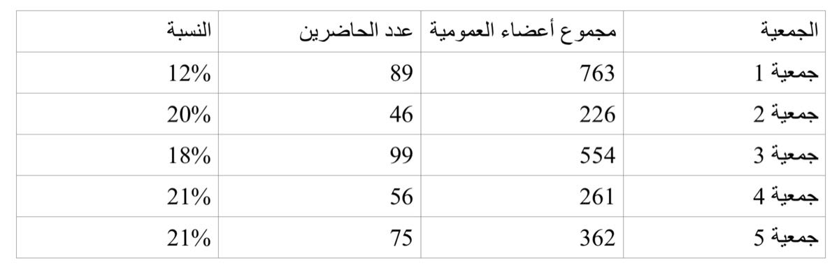 كما ترى فإن حوالي 20% هم من يأتون لاجتماعات الجمعيات العمومية وهذا هو المعتاد. ولذلك أسباب سنأتي عليها. بالمقارنة تقصيت الأمر في بعض الجمعيات خارج المحافظة، في الشرقية، بعضها جمعيات بر وبعضها متخصص فكانت الأرقام كالآتي: