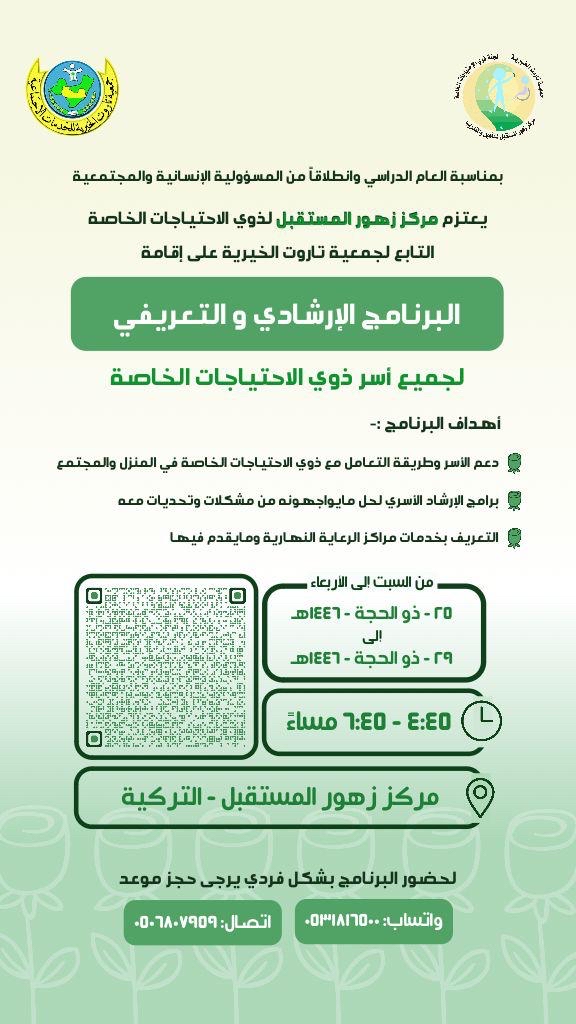 أعلن مركز زهور المستقبل لذوي الاحتياجات الخاصة، التابع لجمعية تاروت الخيرية، عن إطلاق برنامج إرشادي وتعريفي يستهدف جميع أسر ذوي الاحتياجات الخاصة، وذلك ضمن مبادرة تهدف إلى رفع مستوى الوعي والتفاعل الإيجابي مع التحديات اليومية التي تواجهها هذه الأسر، وتحقيق التكامل بين الأسرة ومراكز الرعاية النهارية.