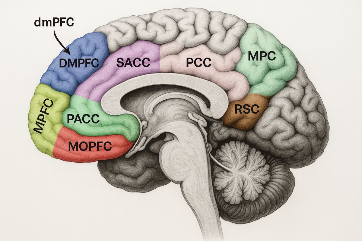 القشرة الإنسية الظهرانية أمام الجبهية dmPFC المشار إليها بالسهم