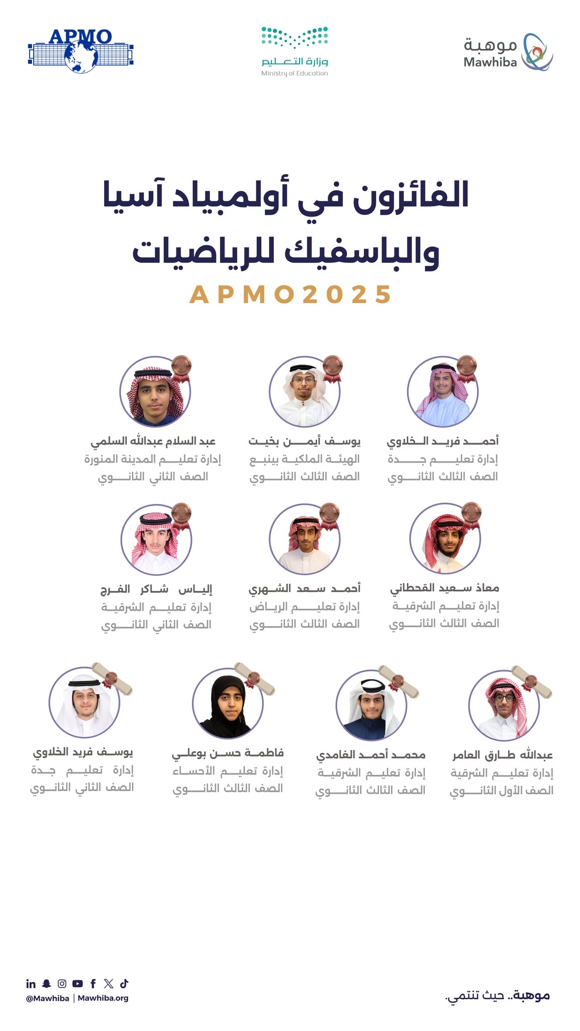 حقق عشرة من الطلاب والطالبات السعوديين فوزًا مشرفًا في منافسات أولمبياد آسيا والباسفيك للرياضيات لعام 2025 «APMO».