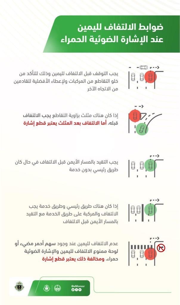 وفي سياق متصل، شددت الإدارة على الضوابط الدقيقة للالتفاف إلى اليمين عند الإشارة الضوئية الحمراء، حيث نبهت إلى وجوب التوقف التام قبل الالتفاف للتأكد من خلو الطريق.