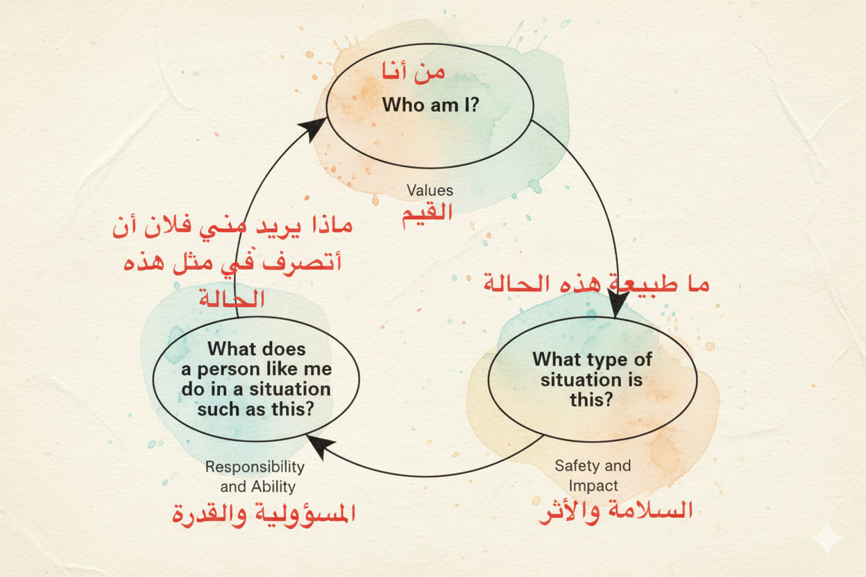 3. كيف يمكن لشخصٍ مثلي أن يتصرّف في وضع كهذا؟ كيف أتحمّل المسؤولية وأتصرف بطريقة تتوافق مع هويتي «طبيعتي» والقيم التي أؤمن بها؟