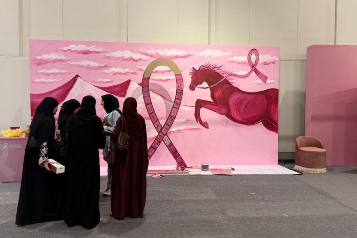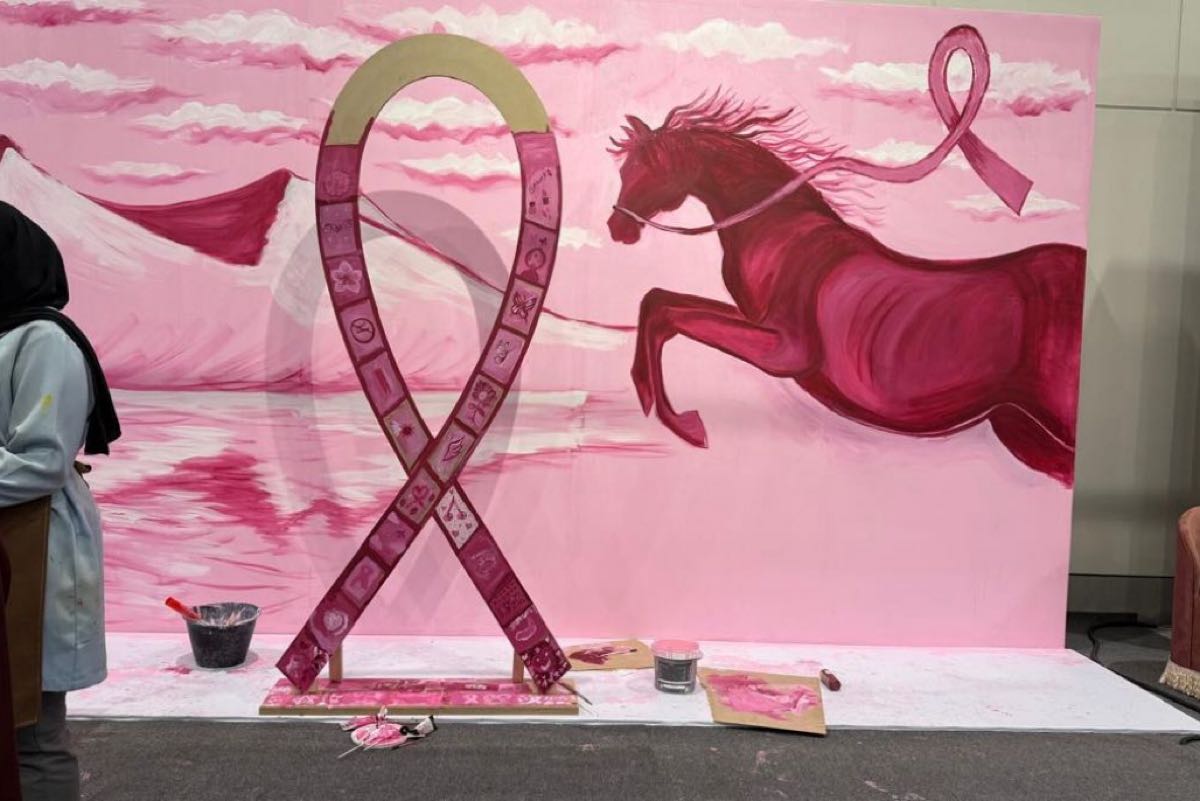 وأشركت آل حمود الحضور في عملها الفني بشكل مباشر، حيث دعتهم إلى تلوين مجسم ”شعار الحملة“ الذي صممته على هيئة ”شريط ذكريات“، ليتحول العمل من مجرد لوحة صامتة إلى سجل بصري حيّ يحمل مشاعر المشاركين وأمنياتهم، في خطوة تهدف إلى تعزيز المشاركة المجتمعية وتقديم الدعم المعنوي للمصابات بسرطان الثدي.