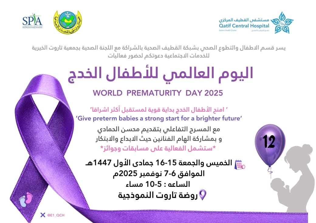 ينظم مستشفى القطيف المركزي، ممثلاً في قسم الأطفال والتطوع الصحي بشبكة القطيف الصحية، فعالية مجتمعية احتفاءً باليوم العالمي للأطفال الخدّج 2025، وذلك بالتعاون مع اللجنة الصحية التابعة لجمعية تاروت الخيرية للخدمات الاجتماعية.