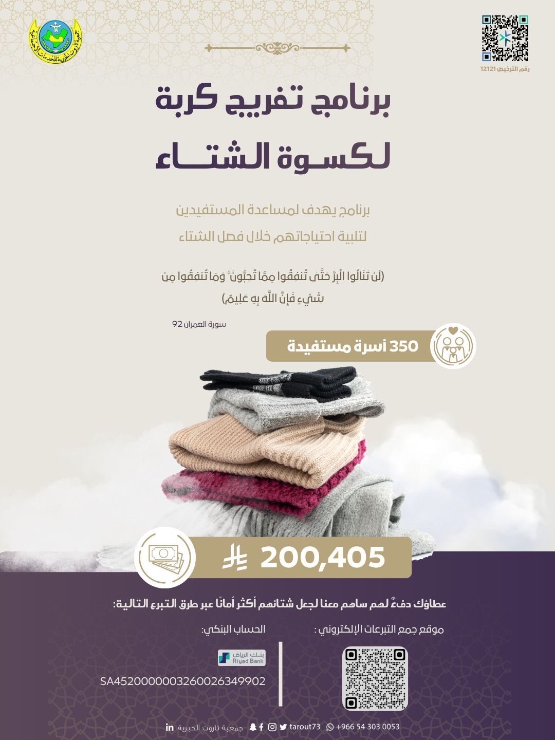 أطلقت جمعية تاروت الخيرية برنامجها الموسمي ”تفريج كربة لكسوة الشتاء“، معلنةً عن بدء استقبال التبرعات لدعم 350 أسرة مستفيدة من خدماتها.