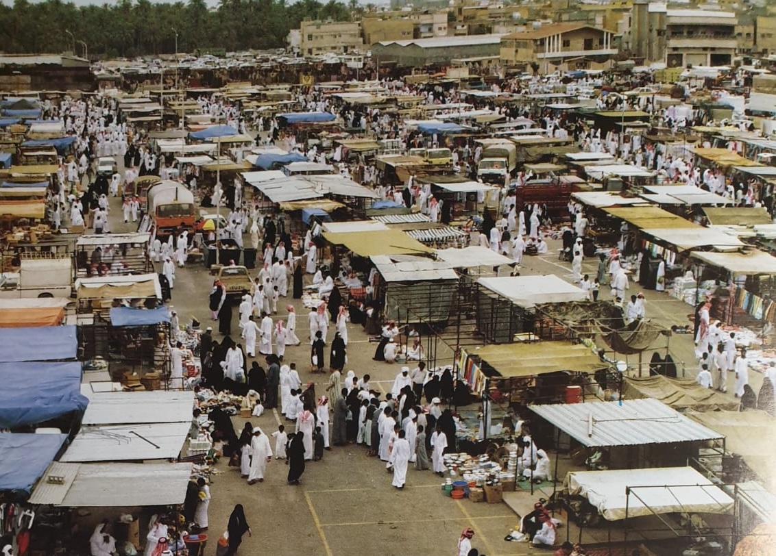 سوق الخميس القديم في حي السطر بشارع الملك فيصل، قبل إزالة المظلات التي كانت تُستخدم كأماكن للباعة «مصدر الصورة: مجلة القافلة تصوير عبد الله يوسف دبيس العدد شهرشعبان 1407 ه/مارس/ابريل 1987 م» والمجلة من أرشيف الأستاذ منصور محروس الصلبوخ - حفظه الله تعالى -.