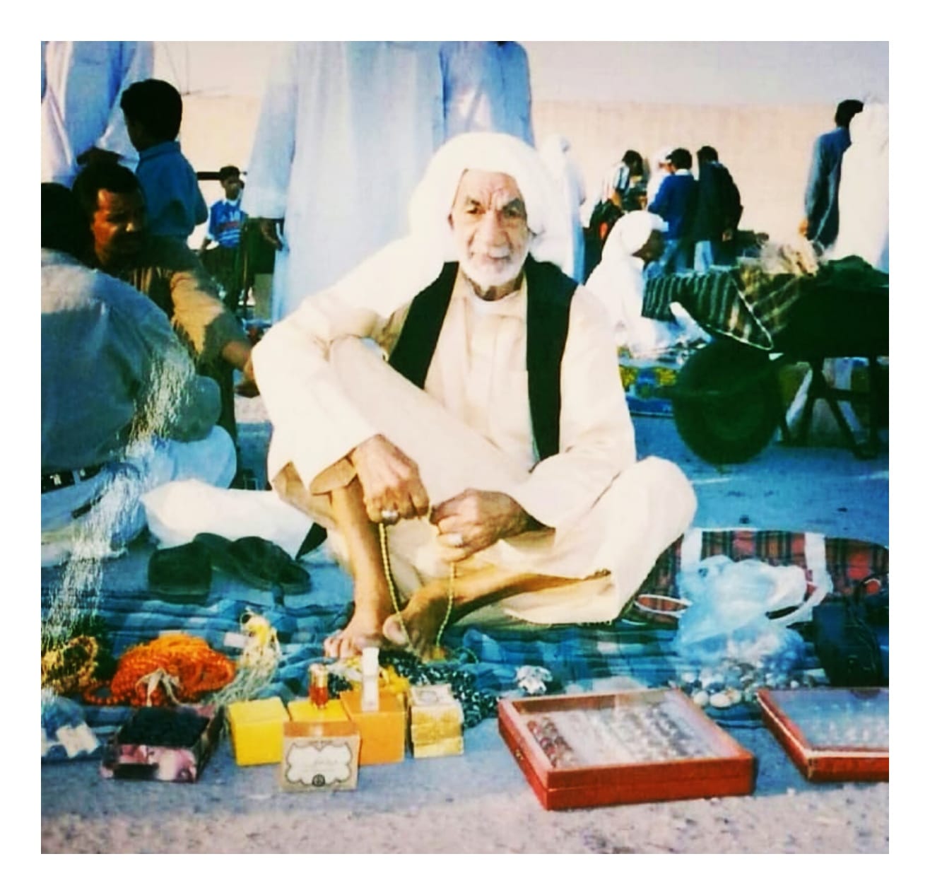 المرحوم الحاج أحمد آل مطر من أهالي بلدة العوامية، أحد أقدم باعة الأحجار الكريمة في محافظة القطيف، حيث واكب مختلف مراحل انتقال السوق، وشارك في عرض وبيع الأحجار الكريمة في جميع المواقع التي تواجد فيها السوق منذ بداياته «مصدر الصورة: مكي خليفة الشاخور».