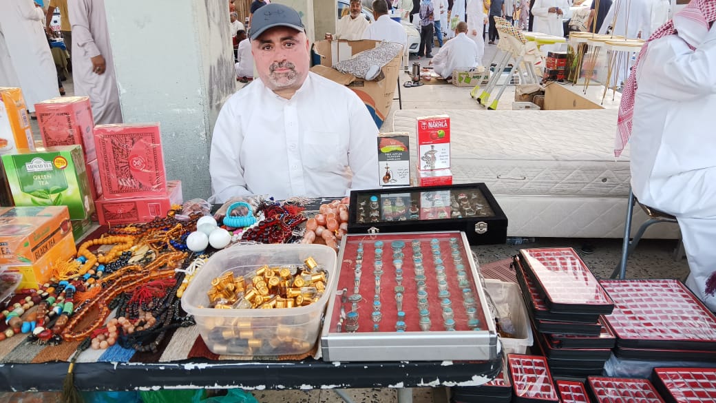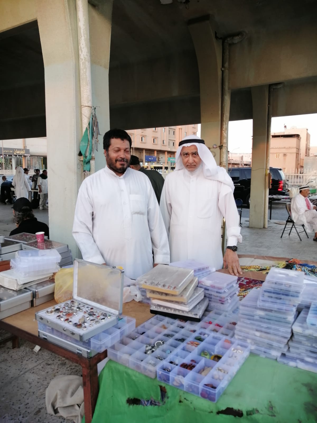 الأخ الحاج علي بن جعفر القديحي ”أبو حسين“ من أهالي الدبابية أحد أقدم الباعة المتجولين في مختلف مواقع سوق بيع الأحجار الكريمة في القطيف، حيث أمضى فيها أكثر من 44 عامًا، مما جعله من الوجوه المعروفة والمخضرمة في سوق الأحجار الكريمة. «تصوير: كاتب المقال».