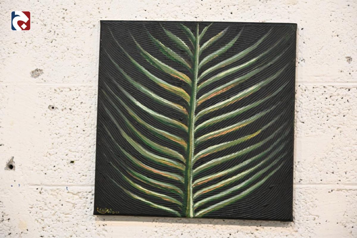 وخطفت الخشرم الأنظار بعملين فنيين يعكسان بحثاً بصرياً عميقاً في تفاصيل النخلة، حيث حولت في لوحتها الأولى ”ريش الطاووس“ قسوة السعف إلى نعومة المخمل عبر مزج لوني ذكي يحاكي تدرجات الطاووس، مدعوماً بلمسات ”الجليتر“ لتجسيد فكرة ”ذهب الأحساء“.