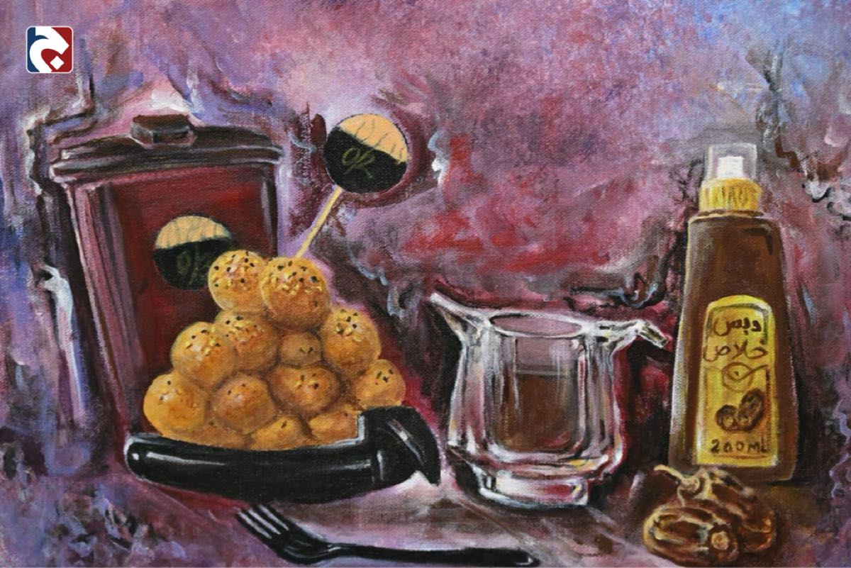 وانتقل الفنان في لوحته الثانية ليرصد التطور الزمني المتسارع في أساليب التقديم، موثقاً انتقال الدبس من المجالس التقليدية و”الكوفية“ القديمة إلى موائد العصر الحديث بأوانيها الفاخرة، مع التأكيد بصرياً على بقاء طعمه الأصيل رغم تغير الأواني.
