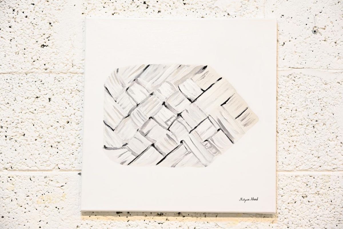 وعززت مشاركتها بعرض نموذج ملموس لقطعة ديكور منسوجة يدوياً من الخوص، دامجة بذلك بين اللوحة التشكيلية والفن التطبيقي لتؤكد العلاقة العضوية المتينة بين العمل الفني الحديث والموروث الشعبي الذي يعاد تشكيله بروح عصرية.