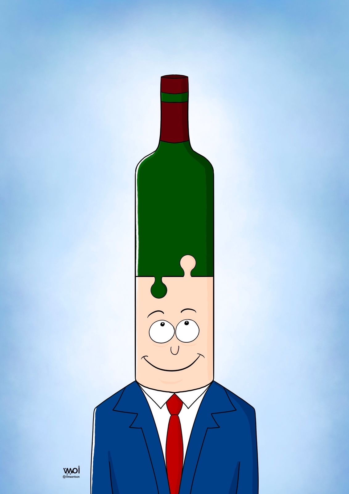 وقدمت اللوحة الفائزة معالجة بصرية فلسفية لموضوع المسابقة لهذا العام وهو ”النبيذ“، حيث جسد الفنان شخصية رجل يرتدي بدلة رسمية وقناعاً للانضباط المهني، بينما يستبدل رأسه بزجاجة خضراء تندمج مع جسده بآلية ”الأحجية“، في إشارة رمزية صارخة لسيطرة الإدمان على الوعي وإلغاء الهوية الإنسانية لصالح الرغبة المجردة.