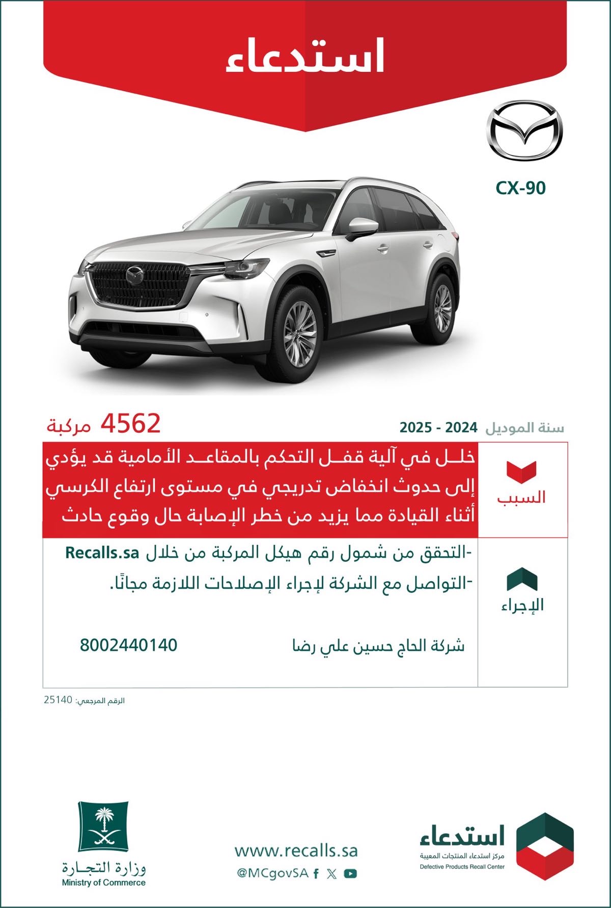 أعلنت وزارة التجارة استدعاء 4,562 مركبة ”مازدا CX-90“ موديلي 2024 و 2025، لوجود خلل تقني في مقاعدها الأمامية قد يهدد سلامة الركاب، داعية الملاك للتواصل الفوري مع الوكيل لإجراء الإصلاحات المجانية اللازمة.