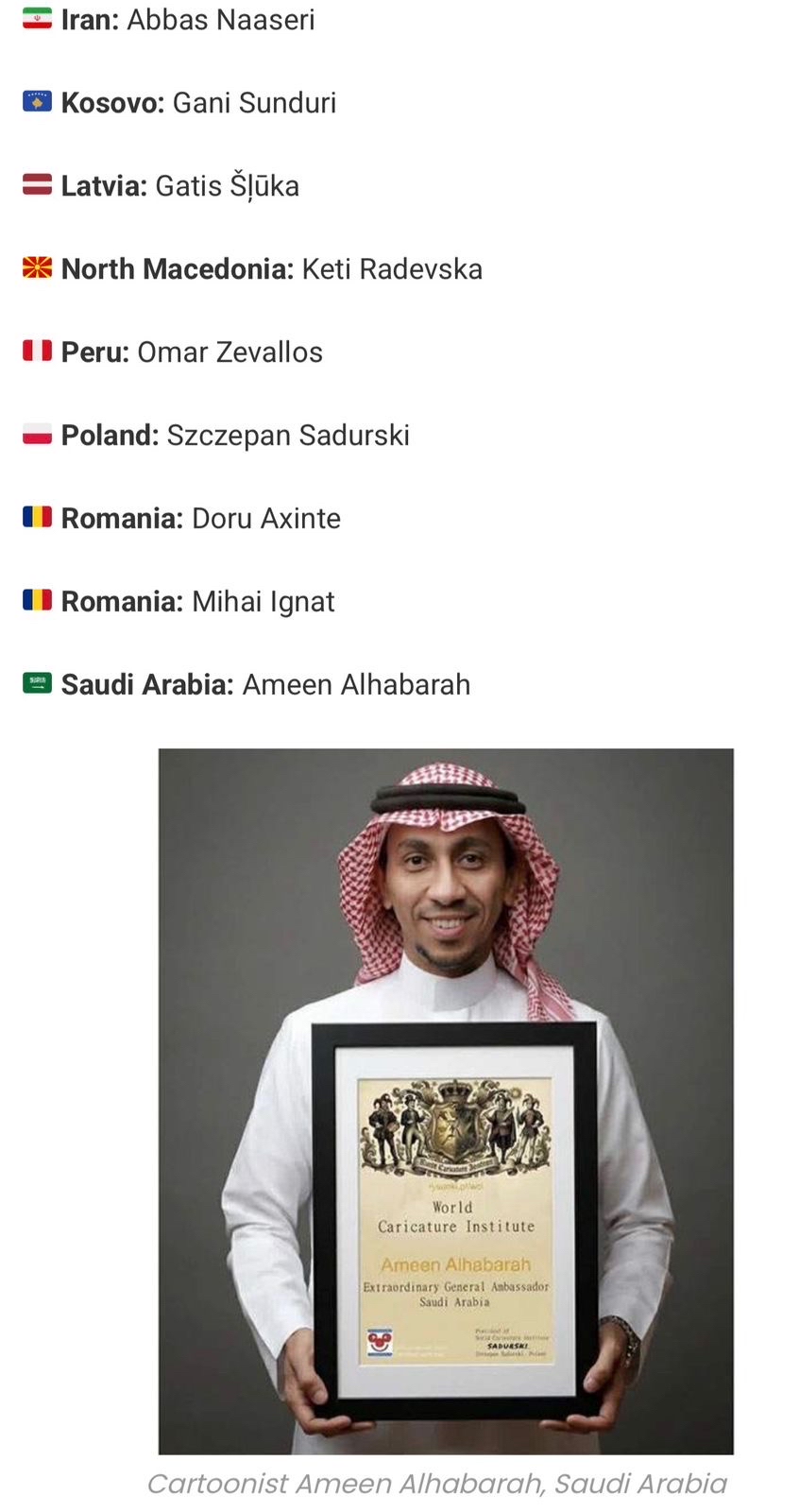 سجل فنان الكاريكاتير السعودي أمين الحباره إنجازاً دولياً بانضمامه رسمياً لعضوية معهد الكاريكاتير العالمي في بولندا، تقديراً لإسهاماته البارزة في فن الكاريكاتير الصامت، ليمثل المملكة ضمن نخبة من أبرز المبدعين عالمياً.