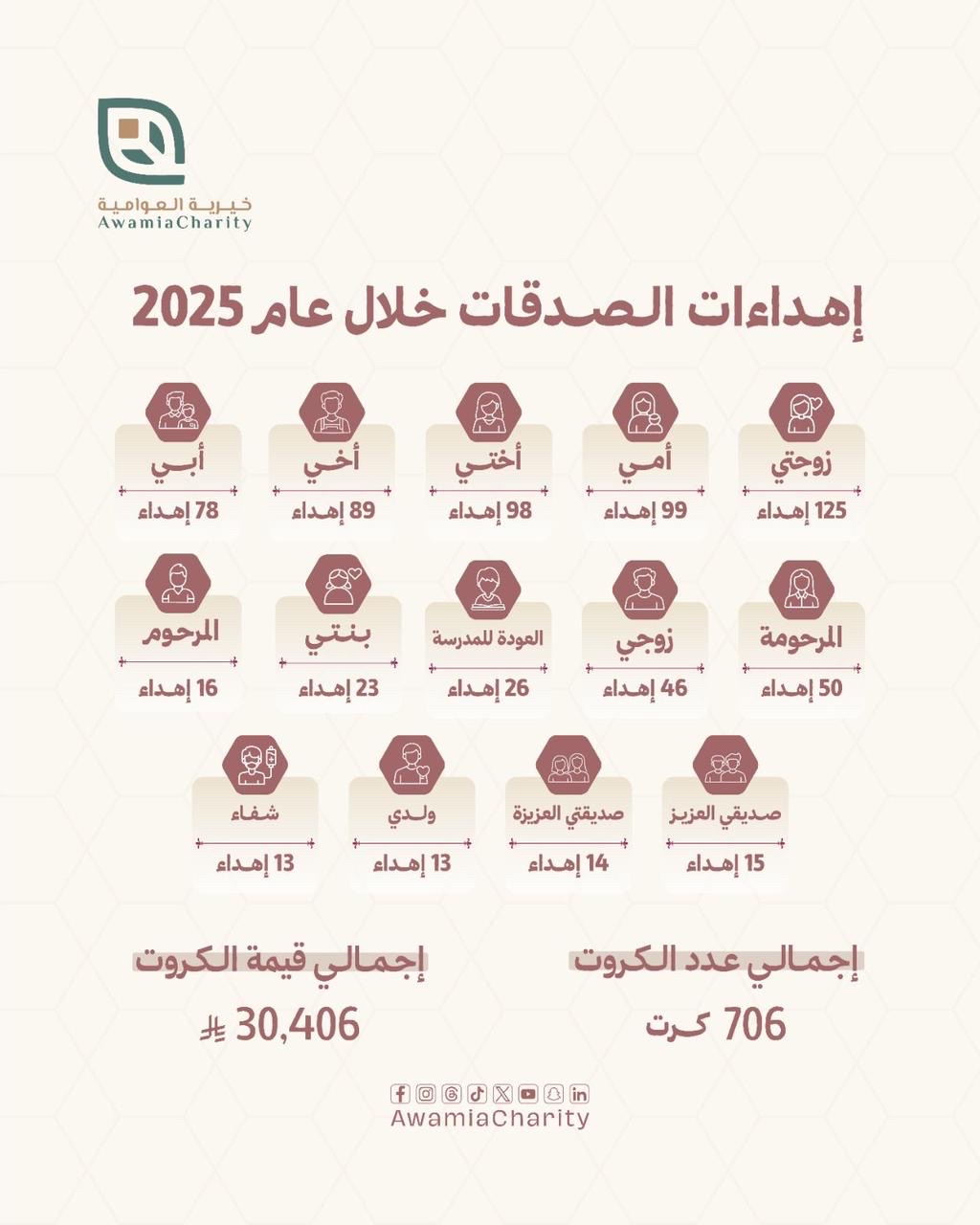 سجلت ”جمعية العوامية الخيرية“ تفاعلاً لافتاً في خدمة الإهداء الخيري الرقمية خلال عام 2025، محققة 706 إهداءات بقيمة تجاوزت 30 ألف ريال، لتعزز التكافل الاجتماعي عبر منصتها الإلكترونية بأساليب مبتكرة.