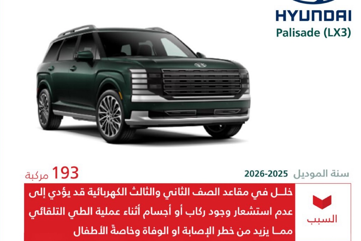 أعلنت وزارة التجارة عن استدعاء 193 مركبة من طراز ”هيونداي باليسيد“ لموديلات 2025 و 2026، لوجود خلل مصنعي خطير في طي المقاعد يهدد حياة الركاب والأطفال، داعية للتحقق من رقم الهيكل فوراً.