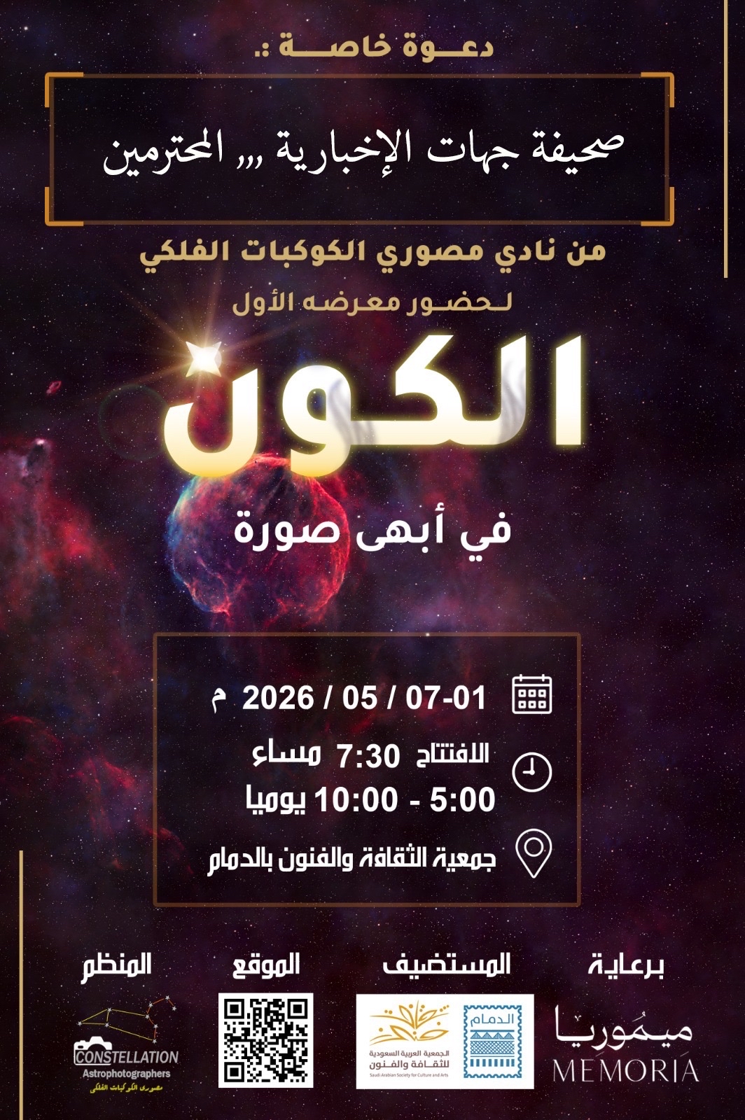 يطلق نادي مصوري الكوكبات الفلكي، مطلع مايو المقبل، معرضه الفني الأول ”الكون في أبهى صورة“ بمقر الجمعية العربية السعودية للثقافة والفنون بالدمام، بمشاركة 18 مصوراً محلياً ودولياً لاستكشاف جماليات الفضاء.