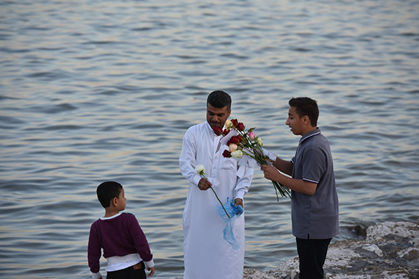 ووصف المنظر بقوله ”كان المنظر جميلًا جدًا، فحين اقتربت ناحيتهم وجدت الكثير من الفتية وهم يحملون السلات المنوعة التي تحوي الورد والريحان إضافة للحلويات“.