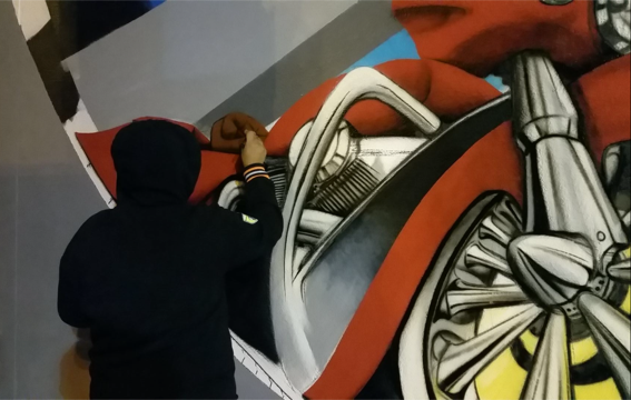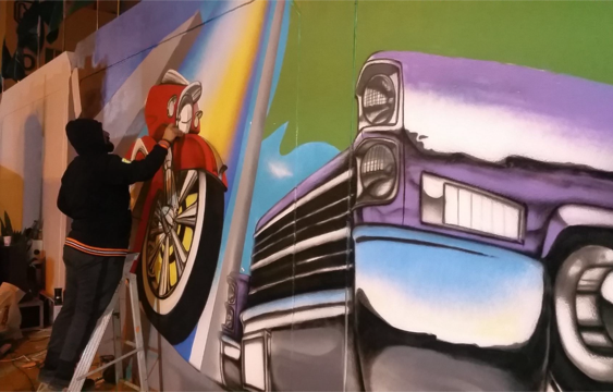 شارك الرسّام فؤاد الغريب - من أهالي الأحساء - برسم لوحة جدارية بزاوية عين السمكة في مهرجان «الشارع الثقافي» في العاصمة الرياض، الذي أنطلق يوم الإثنين الماضي بتنظم أمانة منطقة الرياض وحضور أمير الرياض فيصل بن بندر.