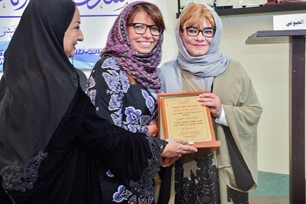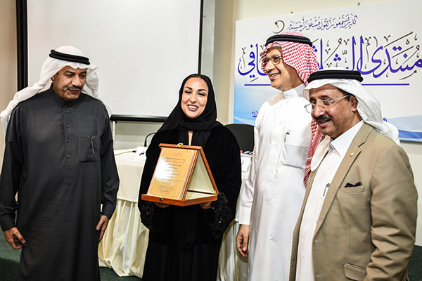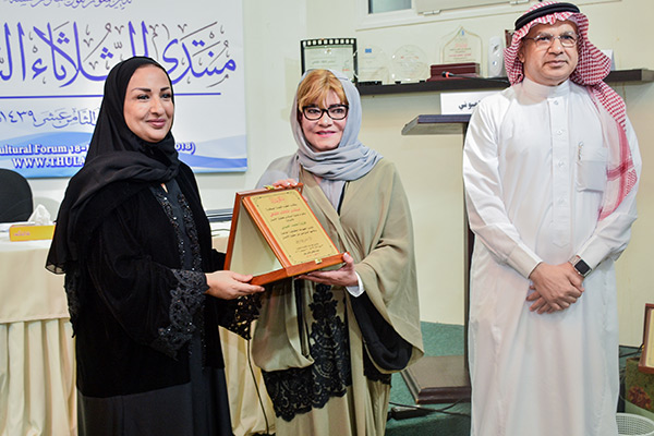 العيوني والذي كرمها منتدى الثلاثاء الثقافي لكونها أحد السيدات اللواتي ناضلن من أجل حقوق المرأة، أهدت تكريمها إلى صديقتها التي شاركتها العمل الحقوقي الناشطة وجيهة الحويدر، في صورة جسدت معاني الوفاء والتقدير.