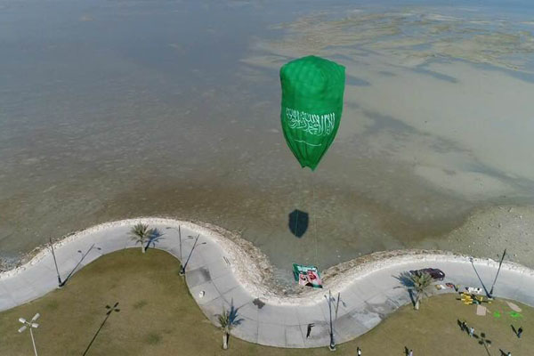 وصنع الحرفي أحمد القديحي منطاد اخضر يبلغ مقاسه ارتفاعه 10 أمتار خلال 72 ساعة من العمل، والذي تم إطلاقه في حضور محافظ القطيف خالد الصفيان.