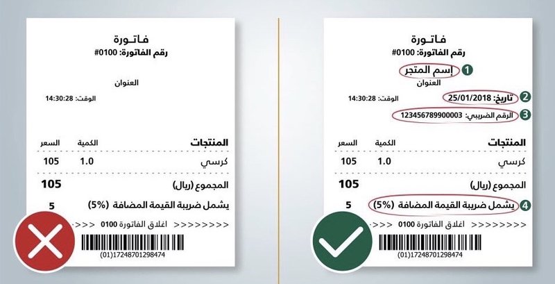 مع قُرب موعد تطبيق القيمة المضافة على جميع السلع والخدمات التي يتم شراؤها وبيعها من قِبَل المنشآت؛ يتوجب أن يكون المستهلك على وعي كامل بصحة دفعها على فاتورة مكتملة التسجيل وفق أربع بيانات تحدد ذلك.