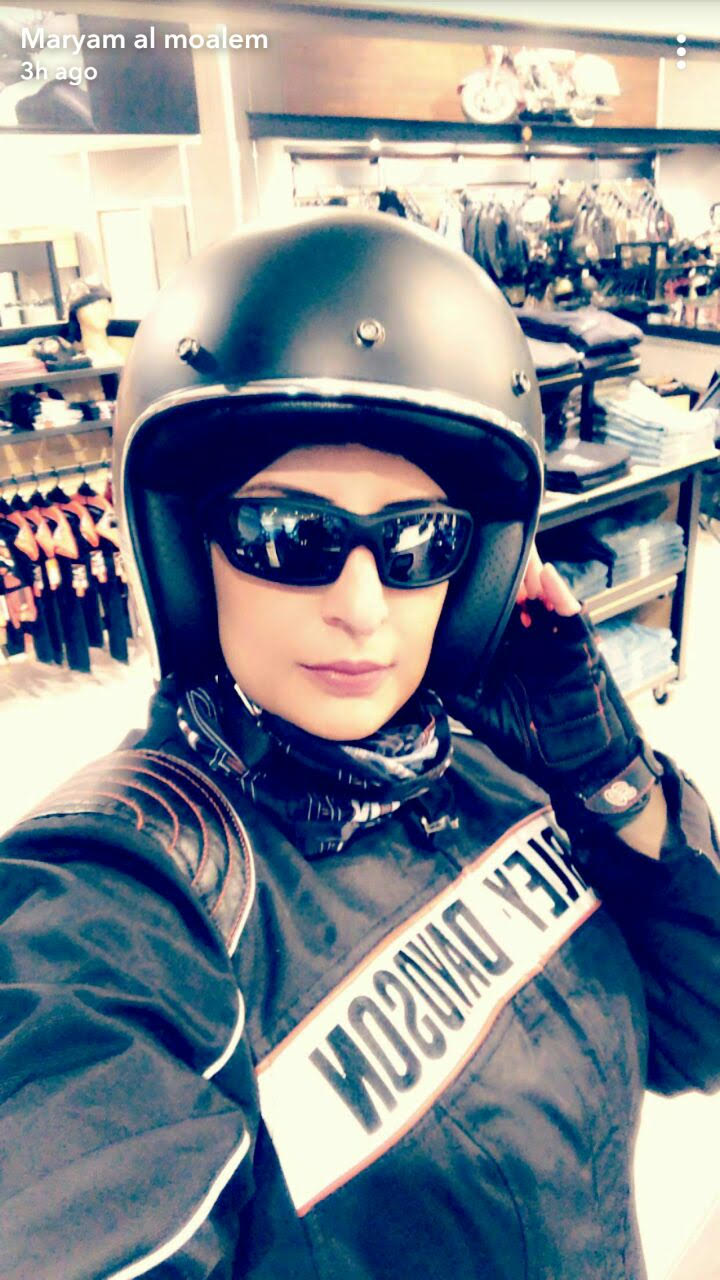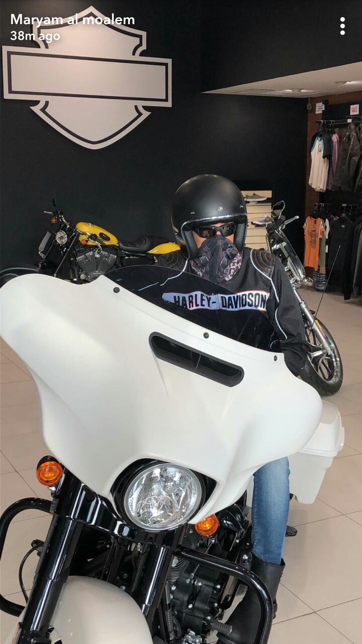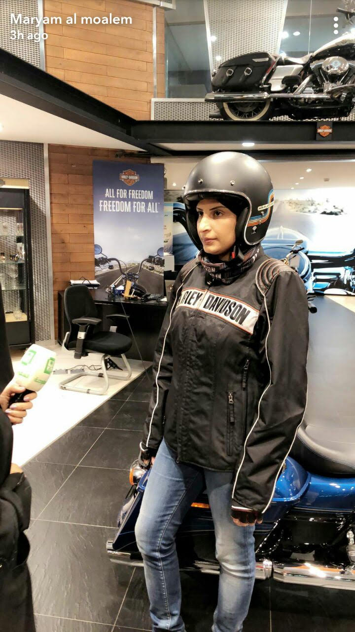 وتضيف المعلم توصلت مع فرع شركة هارلي ديڨيدسون بمدينة الظهران، وتعرفت على عالم الدراجات النارية، بالإضافة الى تعرفها على شركة هارلي التي تعتبر نادي اجتماعي له أعضاؤه ومحبوه وله العديد من المساهمات الإنسانية والتوعوية في المجتمع.