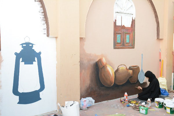 وذكرت قائدة الفريق التشكيلية دلال الجارودي لـ «جهينة الإخبارية» أنها رأت تصميم المبنى يتخذ الطراز التراثي الشعبي القديم، فقررت مع فريقها أن يرسموا على جدرانه رسومات تعنى بالتراث والشعبيات مثل فانوس رمضان والفخاريات والشبابيك القديمة وماشابه.