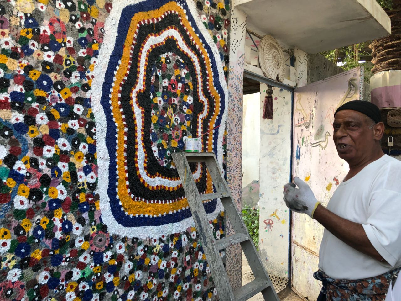 في مزرعته الكائنة على مقربة من حمام أبو لوزة الأثرية في بلدة التوبي، 7 أمتار من سور مزرعته منقوشة بالطيور والزخارف الشعبية، كل متر فيه عدة حكايات ودروس فنية، ممزوجة بعناية في تنوع لوني مدروس بدقة، تتداخل فيها الخامات البارزة من الحصى والرخاميات.