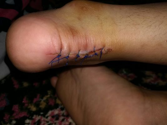 ومضت تقول أن الجرح كان بشكل طولي فوق الوتر الخلفي للساق، مما استدعى من طبيب الطوارئ أن يقوم بخياطة الجرح ست غرز.