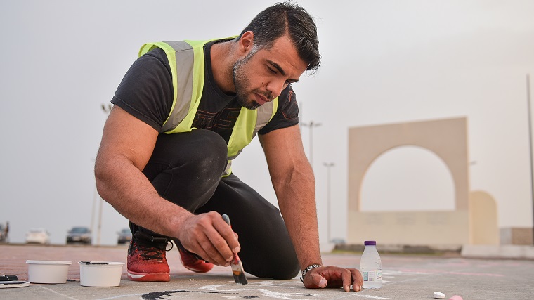 نقش 40 هاوٍ للفن التشكيلي والخط العربي أفكارهم الفنية على أرصفة وكراسي ودورات المياه في كورنيش القطيف، وحولوها للوحات جمالية حباً في الوطن.