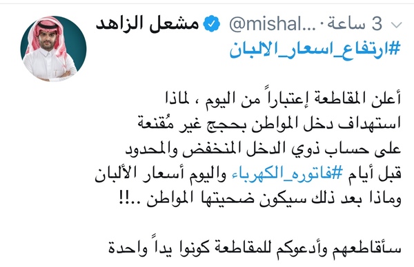 وأعلن مشعل الزاهد عبر الوسم مقاطعته بقوله مستنكرًا ”لماذا استهداف دخل المواطن بحجج غير مقنعة على حساب ذوي الدخل المنخفض والمحدود، قبل أيام فاتورة الكهرباء واليوم اسعار الألبان وماذا بعد ذلك سيكون ضحيتها المواطن“.