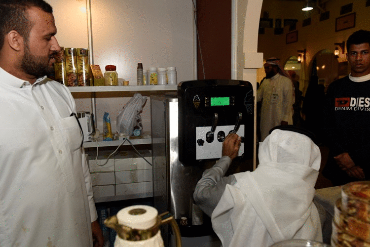 توافد زوار مهرجان تسويق التمور بالأحساء لاسيما الأطفال على ”آيسكريم الدبس“، والذي عرضه صاحب أكبر مصنع إنتاج لدبس التمر على مستوى المملكة محمد بن قوطي.