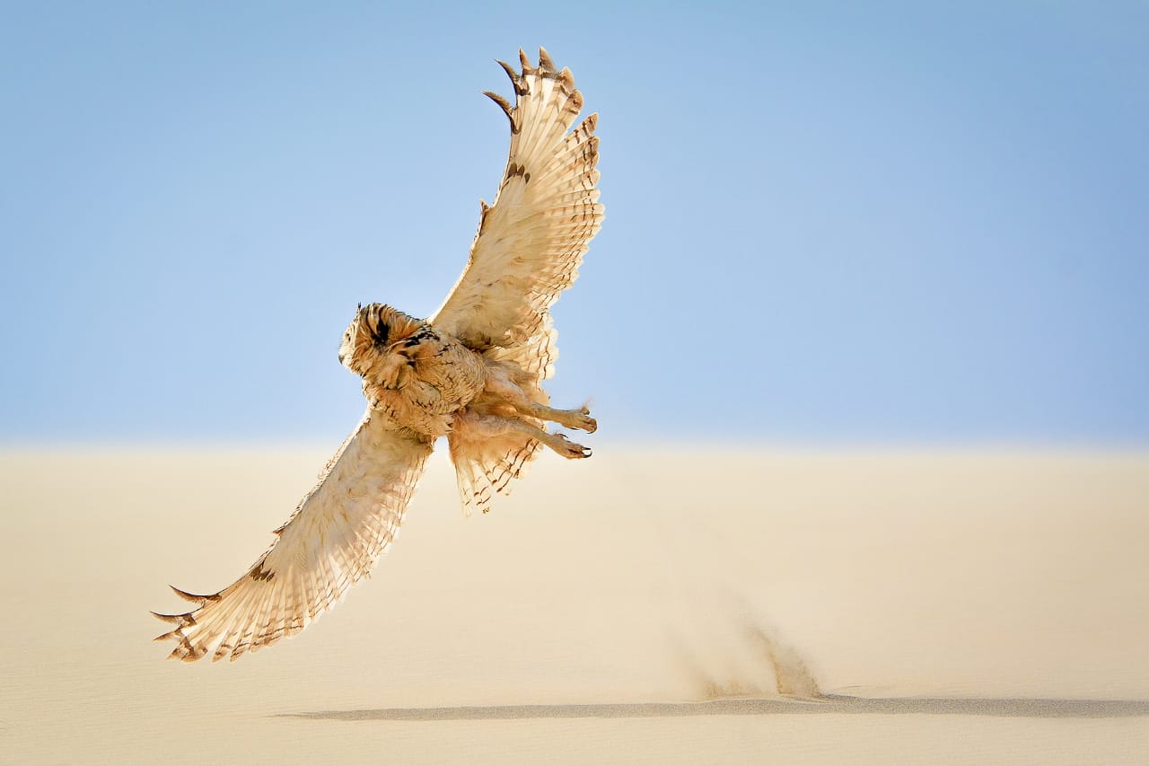 واضاف أن المشاركة عبارة عن مشروع فوتوغرافي من 12 صورة وهو العدد المطلوب المقرر ضمن الشروط، وأن جميع الصور تعود لأنثى طائر البوم الفرعوني ويعرف علمياً باسم ”Bubo ascalaphus“.