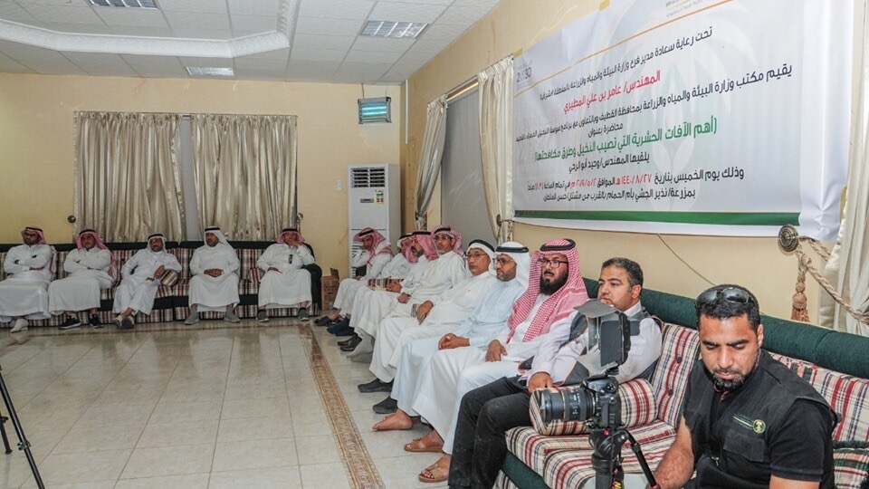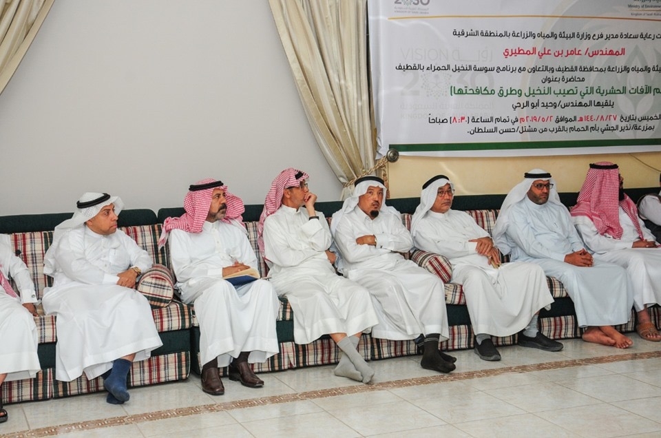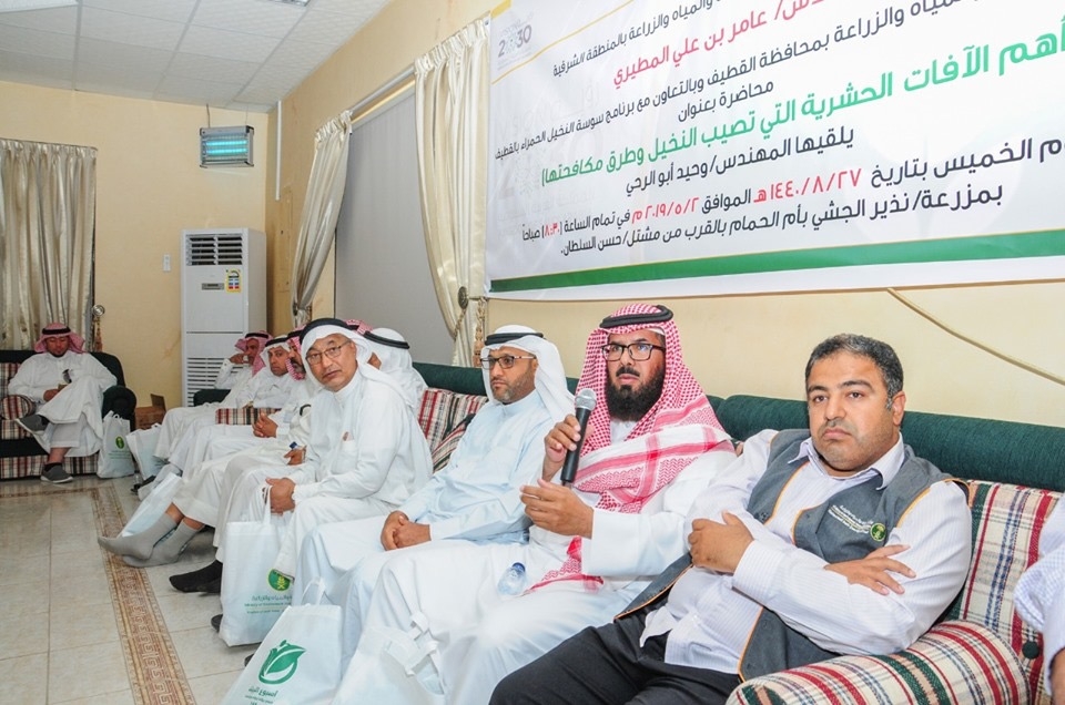 نظم مكتب وزارة البيئة والمياه والزراعة بالقطيف بالتعاون مع برنامج مكافحه سوسة النخيل الحمراء في مزرعة نذير الجشي ببلدة ام الحمام محاضرة بعنوان «اهم الآفات الحشرية والحيوانية التي تصيب النخيل وطرق مكافحتها» لمنسوبي الوزارة وجمعٌ من المهتمين والمزارعين.