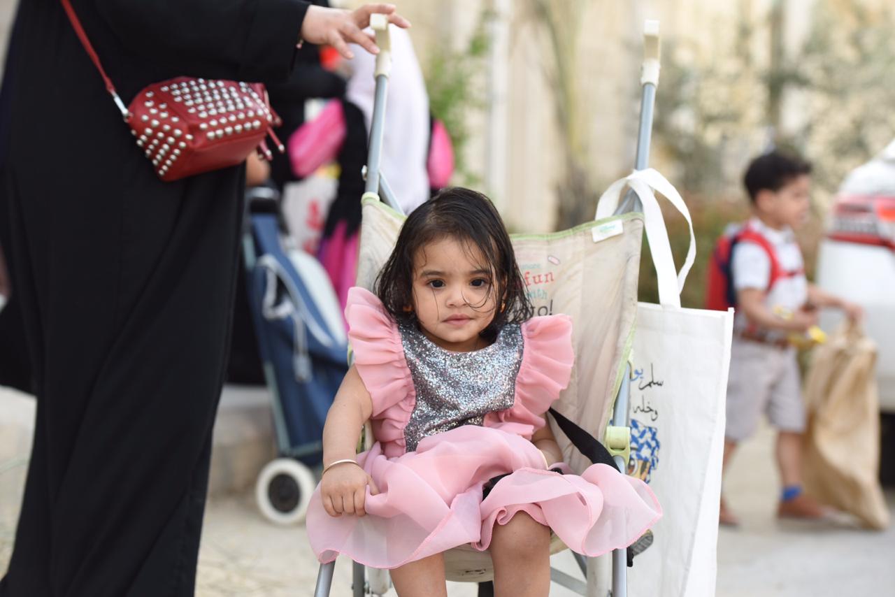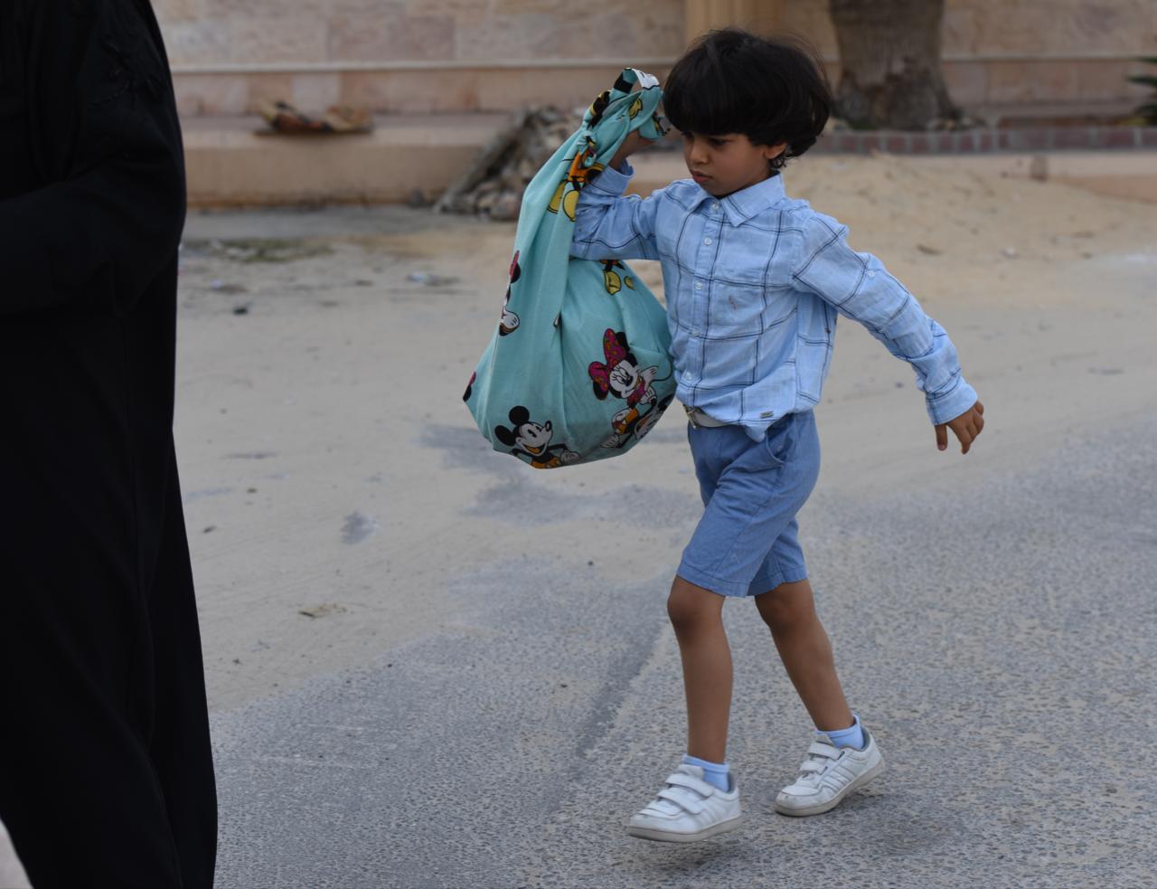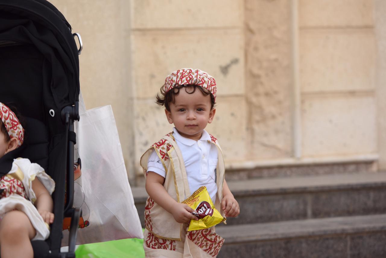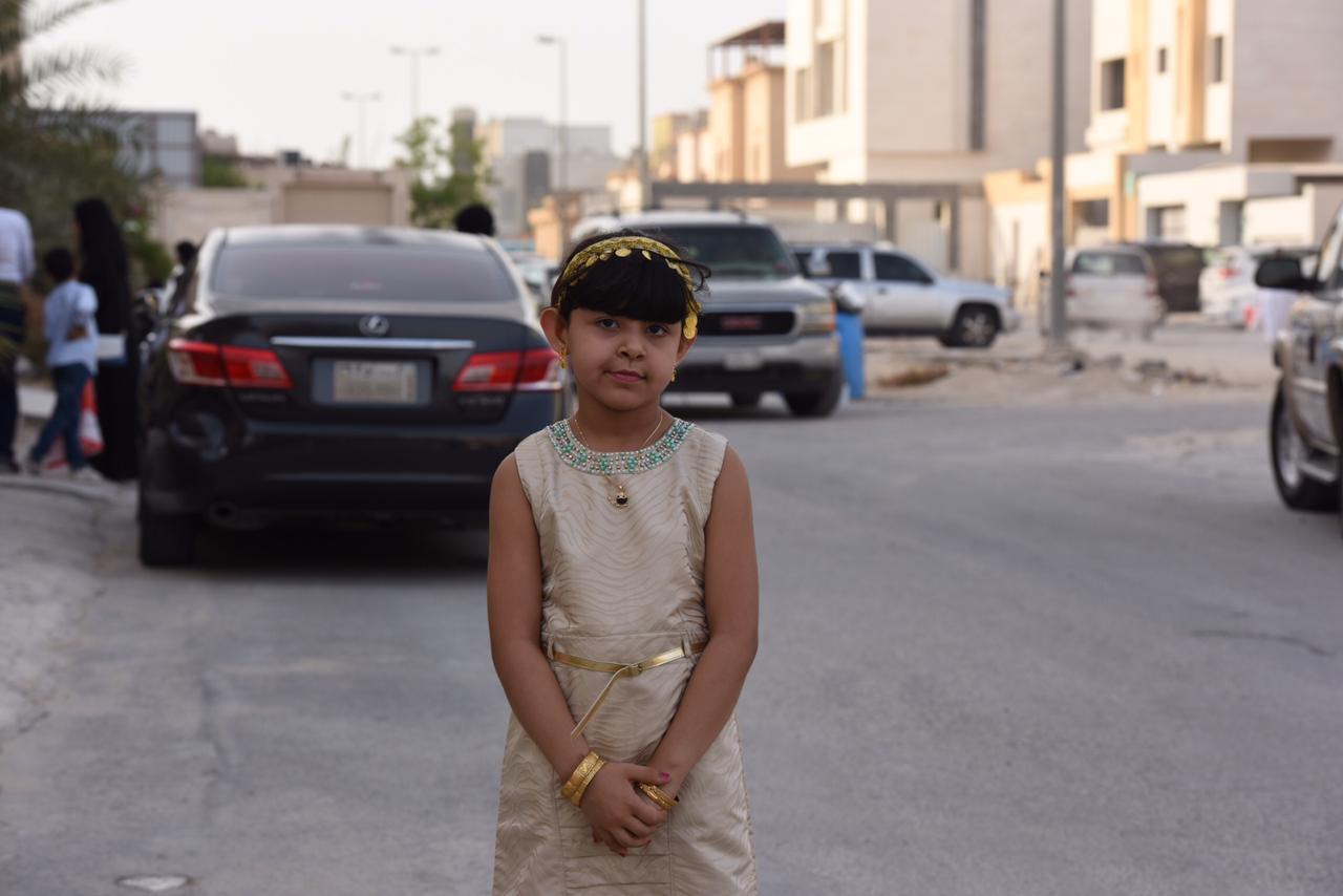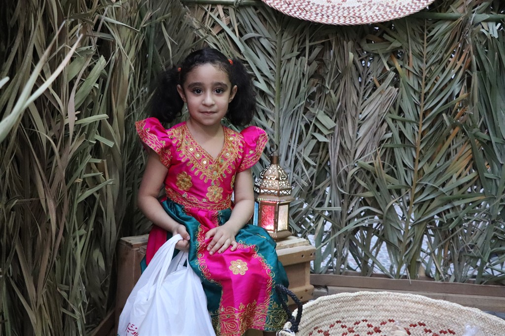 وارتدت الفتيات الصغيرات ما يعرف ب «المخنق او الملفع» وهو حجاب مطرز بالزري الذهبي والفضي والجلابيات المحاكة بالزخارف والنقوش الملونة وهن يحملن اكياسهن التي امتلأت بمختلف التوزيعات.